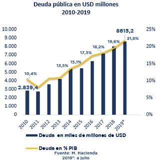 Según el último informe publicado por el Ministerio de Hacienda, al mes de julio del presente año, la deuda pública ascendió a USD 8.615,2, siendo USD 575 millones superior a la registrada al cierre del 2018. Comparando el valor de la deuda actual respecto al valor del cierre del año 2013, la misma aumentó 106%, es decir, se duplicó con respecto a la cifra registrada a finales de dicho periodo.