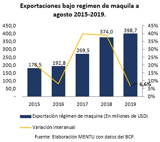 Según el ultimo informe publicado por el BCP1, las exportaciones bajo régimen de maquila registraron a agosto del presente año un incremento interanual del 6,6%, siendo uno de los pocos sectores que en lo que va del año registró un aumento con respecto al 2018, ayudando a compensar la caída de las exportaciones totales que a agosto, disminuyeron en 8,4%.