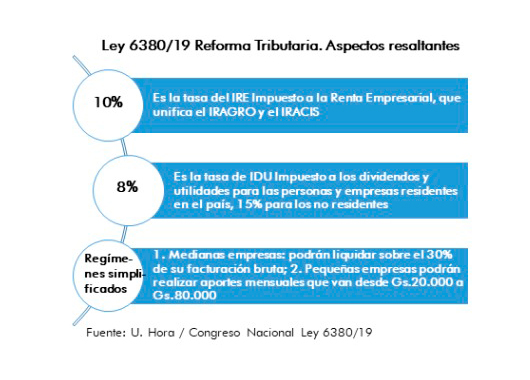La Ley 6380/19 de «Modernización y Simplificación del Sistema Tributario Nacional» fue promulgada ayer por el Poder Ejecutivo y entrará en vigencia desde el 01 de enero del 2020. La reglamentación de la misma se hará de forma gradual, previéndose para este año la de los anticipos de los impuestos que se liquidarán en forma anual.