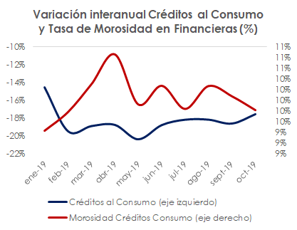 Al cierre del mes de octubre, los créditos destinados al rubro de consumo en las financieras sumaron G. 1,03 billones, 18% menos en términos interanuales, excluyendo los datos de Río correspondientes al 2018. La menor asignación de recursos a este segmento estuvo acompañada de una suba de la tasa de morosidad que llegó al 9,8%, superior en 0,7% p.p con respecto a octubre de 2018.
