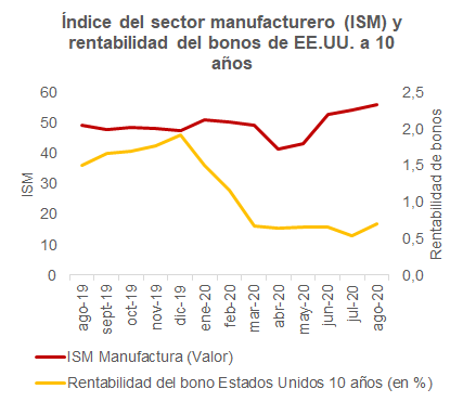 En agosto de 2020, el índice PMI de los Estados Unidos tuvo un valor de 56. El mejoramiento con relación a los meses anteriores se explica por los nuevos pedidos que se dieron en el mes.