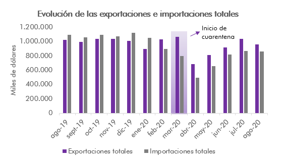 Desde inicios del corriente año al mes de agosto, se realizaron transacciones en el comercio exterior (Exportaciones + Importaciones) del país por un valor de USD 13.856,8 millones, representando así una reducción del 16,1% respecto al mismo periodo del 2019.