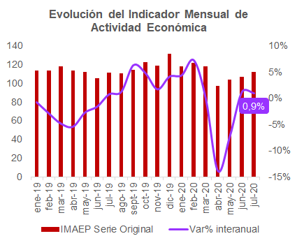 En julio del corriente año, el Indicador Mensual de Actividad Económica (IMAEP) registró un crecimiento de 0,9% comparado al mismo mes del año anterior, con lo que la variación acumulada fue negativa en 0,3%. No obstante, el aumento interanual fue menor al de junio, lo que reflejaría la persistencia de la incertidumbre.