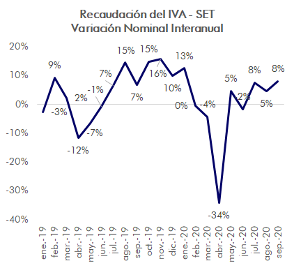 El Viceministro de Tributación informó que al cierre de septiembre la recaudación tributaria ascendió a Gs. 1,73 billones, la mayor recaudación mensual desde inicios de la pandemia. A ello habría contribuido el aumento superior al 8% interanual en la recaudación del Impuesto al Valor Agregado (IVA).