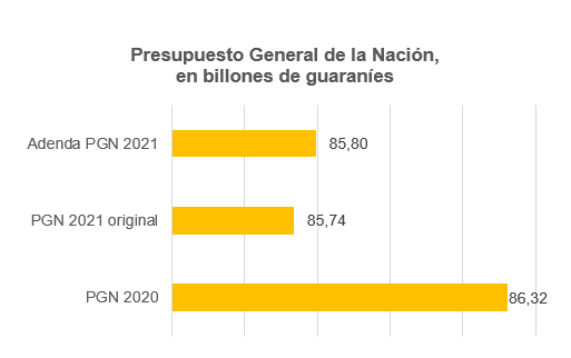 Así, el monto adicional incorporado en el PGN 2021 es de Gs. 60,3 mil millones, lo se traduce en un total de Gs. 85,8 billones para el ejercicio fiscal 2021, lo que representa un crecimiento del 0,07% respecto al proyecto original y una caída del 0,6% comparado al PGN 2020.