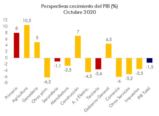 En el sector primario, no se observan cambios en cuanto a las perspectivas de crecimiento, manteniéndose en 8% teniendo en cuenta los resultados favorables que alcanzaron los productos agrícolas más importantes al cierre de la campaña 2019/2020, en especial la soja.