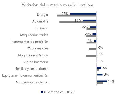 Las perturbaciones económicas provocadas por COVID-19 han afectado a algunos sectores significativamente más que a otros. En el segundo trimestre de 2020, el valor del comercio mundial en los sectores automotriz y energético fue aproximadamente la mitad de lo que era en el segundo trimestre de 2019.Por otro lado, aumentaron las importaciones de maquinaria de oficina y textiles y confecciones. Dichos aumentos están relacionados con la pandemia, ya que estos sectores incluyen equipos de oficina en el hogar y equipos de protección como máscaras. Esta situación se presenta patrones similares para los meses de julio y agosto del corriente año.