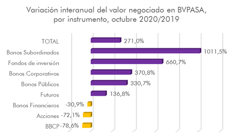 Teniendo en cuenta los datos de la Bolsa de Valores y productos de Asunción S.A (BVPASA), al cierre del mes de octubre del corriente año el valor total negociado fue de Gs. 1,5 billones, USD. 209,1 millones, lo que representa un crecimiento de 271% respecto al mismo mes del año anterior. Con esto, el volumen acumulado al décimo mes del año asciende a Gs. 10,8 billones, USD. 1,6 mil millones, cifra 122% superior al mismo periodo del 2019.