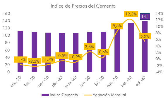 Todo esto contribuyó a un incremento del precio del cemento, con lo que al décimo mes del año el índice de precios al cemento alcanzó un nivel de 141, mostrando un crecimiento interanual de 35,5%.