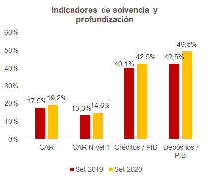 Según el Informe de Estabilidad Financiera del BCP, en el tercer trimestre del año los indicadores de solvencia financiera superan los requerimientos mínimos de suficiencia de capital: el ratio de capital principal sobre activos y contingentes ponderados por riesgo (CAR Nivel 1) se ubicó en 14,6%, mientras que el ratio de capital regulatorio sobre activos y contingentes ponderados por riesgo (CAR) fue de 19,2%, siendo los mínimos exigidos de 8% y 12%, respectivamente.