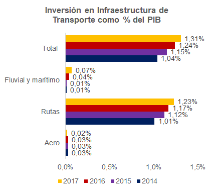 Según la Comisión Económica para América Latina y el Caribe (CEPAL), en Paraguay la inversión en infraestructura es destinada principalmente a la construcción de rutas y aumentó 22,7% del 2014 al 2017.