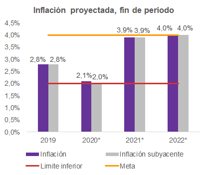 Considerando el comportamiento probable de las variables macroeconómicas internas y externas para el 2021, la banca matriz espera que la inflación sea baja hasta el primer trimestre del siguiente año y luego crezca hasta posicionarse en torno al 4% desde el tercer trimestre de próximo año hasta el cierre del 2022.