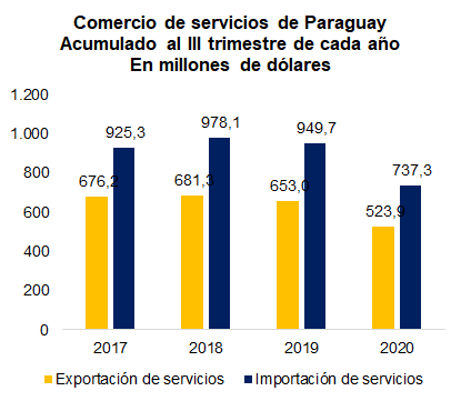 En el caso de Paraguay, al tercer trimestre del 2020, la balanza de servicios experimentó una caída del 28% como consecuencia de la disminución de servicios de viajes.
