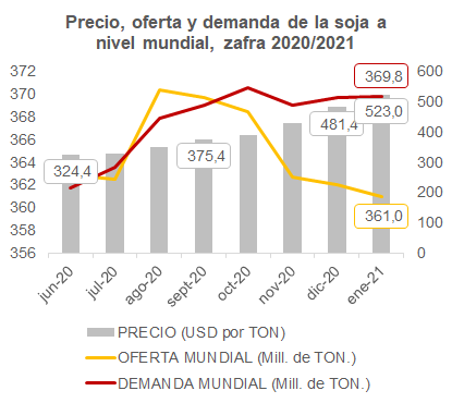 A nivel mundial, la combinación de la disminución de la oferta y el aumento de la demanda ha provocado que los precios internacionales de la oleaginosa aumenten significativamente, llegando a USD 523 por tonelada al primer mes del 2021.