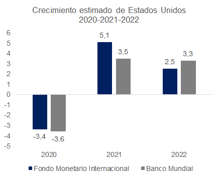 El pronóstico del Fondo Monetario Internacional para el PIB estadounidense del 2021 apunta a un crecimiento de 5,1%, considerando que el proceso de vacunación sería muy efectivo, mientras que el Banco Mundial prevé una expansión de 3,5%.