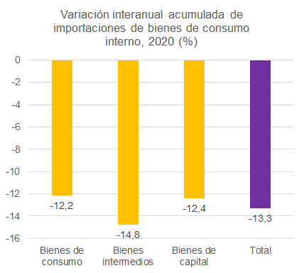 Teniendo en cuenta por grupos, los de mayor incidencia sobre este resultado fueron los bienes intermedios, con un crecimiento negativo interanual de 14,8%, debido principalmente a la menor importación de combustibles en 26,3%. A estos les siguen los bienes de consumo, los cuales presentaron una variación negativa acumulada del 12,2% y los bienes de capital con un decrecimiento del 12,4% respecto al 2019, lo que se puede explicar debido a la reducción de importación de las maquinarias, aparatos y motores en 8,2% y de los elementos de transporte y otros en 20,3%.