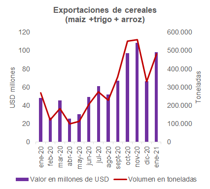 Al cierre del primer mes del año, las exportaciones de cereales (maíz, trigo y arroz) alcanzaron los USD 98,1 millones, valor que duplica al de un año atrás y que corresponde al envío de 480.652 toneladas, cifra que significa un aumento interanual de 78,7% en volumen.