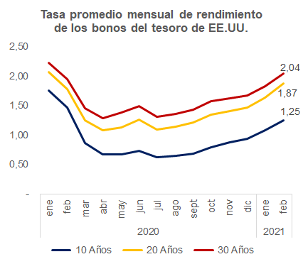 No obstante, la Reserva Federal (FED) minimizó el impacto de un aumento de los rendimientos de la deuda pública estadounidense a largo plazo y lo consideró como una señal del creciente optimismo sobre la economía, que podría cobrar fuerza a medida que más personas se vacunen. Pese a dicha tendencia ninguno de los funcionarios de la FED ha dado señales de interés en endurecer la política monetaria. Consideran que es demasiado pronto para hablar de reducir la flexibilidad ya que el elevado desempleo, la baja inflación y la incertidumbre sobre las perspectivas económicas persisten.
