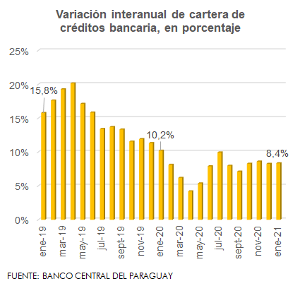 Ante el retorno de las actividades en los diversos sectores de la economía, la necesidad de financiamiento ha aumentado. El total de créditos otorgados en el sistema bancario ascendió a Gs. 101,6 billones, que, si bien es 8,4% superior en relación al mismo mes del año pasado, también es 1,86 puntos porcentuales (p.p.) inferior al crecimiento del enero del año pasado, demostrando menor dinamismo.