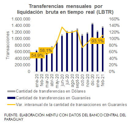 En el contexto actual, la necesidad de contar mecanismos de pago que otorguen a los agentes mayor practicidad a la hora de realizar transacciones ha conducido a que los pagos vía transferencias entre entidades financieras se incrementen. Las mismas totalizaron en febrero 1.375.414, considerando las realizadas en guaraníes y dólares. Esto representa incrementos interanuales de 110,1% y 29,2%, respectivamente, de las operaciones en dichas divisas.