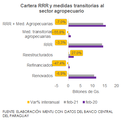 En ese sentido, se produjo una baja de 6,9% en la cartera de créditos renovados, que representa más del 75% del total (Gs. 10,7 billones), y una disminución de los créditos refinanciados en 47,4% (a Gs. 332,2 miles de millones). Por su parte, el incremento del 27% de los créditos reestructurados, que representan 20,7% del total, no fue suficiente para compensar la caída de la cartera RRR.