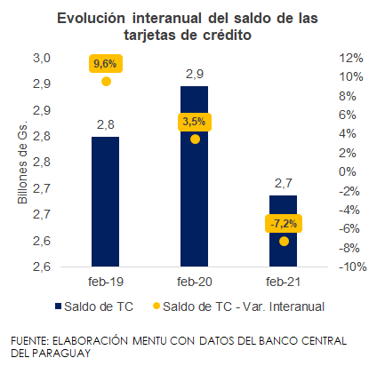 En febrero, el saldo de las tarjetas de crédito emitidas por el sistema bancario totalizó Gs. 2,69 billones, lo cual representa una disminución interanual de 7,2%, caída que se da a pesar de la reducción interanual de su tasa de interés promedio de 0,72 puntos porcentuales (p.p). Esta variación contraria a la de prepandemia, señala que los agentes económicos aun mantienen cautela en sus gastos.