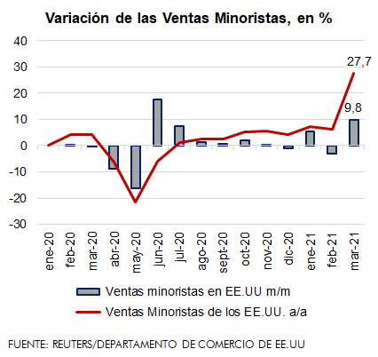 Según el Departamento de Comercio de EE.UU., las ventas minoristas crecieron 9,8% en marzo comparadas con el mes anterior; mientras que se incrementaron 27,7% en relación al mismo mes del 2020. No obstante, en este último resultado se debe considerar que, durante el tercer mes del pasado año, la actividad del país estaba paralizada debido a la pandemia.