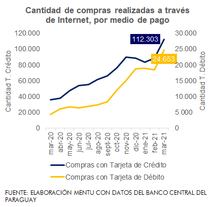 En marzo, se realizaron 136.956 compras a través de Internet, por valor de Gs. 27,7 mil millones, esto significa 2,4 veces más en cantidad y 1,5 veces más en valor, en comparación al mismo mes del año anterior. Del total de transacciones 82% fueron pagadas con tarjetas de crédito y 18% con tarjetas de débito.