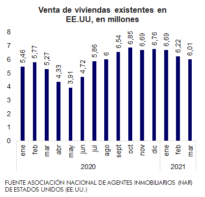 La Asociación Nacional de Agentes Inmobiliarios (NAR) registra las ventas promedio de viviendas existentes en EE.UU. para el mes en cuestión (m/m). Según este organismo en marzo de 2021 se vendieron 6,01 millones de viviendas, a un precio de venta promedio de USD 329.100. Si bien se observa que las ventas de viviendas existentes cayeron en marzo, marcando dos meses consecutivos de menor desempeño, el precio de venta medio ha aumentado 17,2% interanual. .