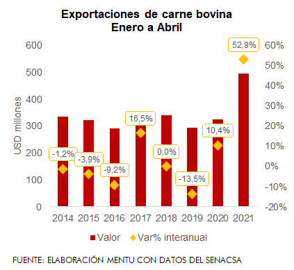 Las exportaciones de carne bovina al cierre del cuarto mes del año ascendieron a USD 495,7 millones, por 111.385 toneladas enviadas, presentando así aumentos de 52,9% y 51,4% en valor y cantidad, respectivamente, en relación al mismo periodo del 2020. Los principales destinos fueron Chile, Rusia, Taiwán y Brasil.