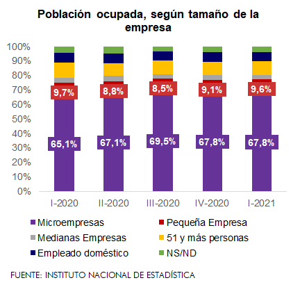 Al cierre del primer trimestre del corriente año, 67,8% de la población se encontraba trabajando en microempresas, 9,6% en pequeñas y 3% en medianas empresas. En total, las Mipymes empleaban al 80,4% del total de la población ocupada, es decir, a 2.777.895 de personas.