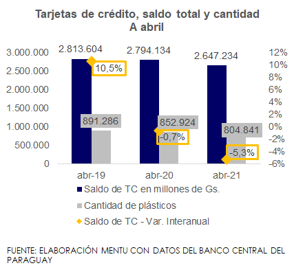 Si bien la actividad económica mejoró respecto a un abril del 2020 con restricciones y el promedio de la tasa de interés aplicada a las tarjetas de crédito continúa su tendencia bajista, el desempeño interanual negativo tanto del saldo contable como de la cantidad de las mismas persiste