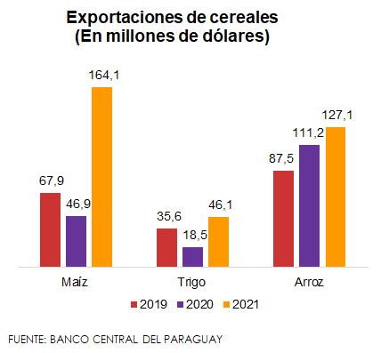Al cierre del mes de mayo, las exportaciones de cereales (maíz, trigo y arroz) ascendieron a USD 337,3 millones por 1.354.663 toneladas, con aumentos interanuales de 91% y 72,7% en valor y volumen, respectivamente. En cuanto a los principales mercados de destino para los tres cereales fueron Brasil y Chile, registrándose una importante demanda del primero debido a la menor producción y al atraso de su cosecha.