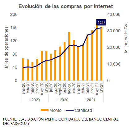De esta manera, se realizaron 802.547 compras con tarjetas de crédito y débito a través de Internet por valor de Gs. 167,3 mil millones, lo cual es aproximadamente 95% superior al monto acumulado durante el mismo periodo del año pasado. De dichos números, el 20% de las compras fueron realizadas durante el mes de junio, con Gs. 32,4 mil millones negociados por 159.000 transacciones. Así, internet continúa posicionándose como uno de los medios de pago vía plataformas, aplicaciones y mecanismos digitales preferidos, por la comodidad y facilidad que ofrecen a los comercios y agentes.