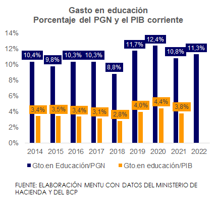 En el proyecto de Presupuesto General de Nación (PGN) 2022, el gasto en educación presenta un aumento de 4,3% con relación al vigente, con lo que el total de Gs.10,4 billones asignado continua siendo limitado con relación a los desafíos que enfrenta la educación paraguaya. Dicho aumento se debería en parte importante al ajuste de salarios de los docentes.