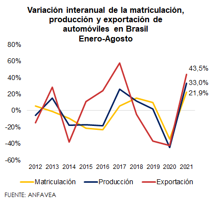 En la mismo sentido, de enero a agosto de 2021 se matricularon cerca de 1,4 millones de vehículos, 21,9% más que en el mismo periodo del año anterior. Por su parte, la exportación de vehículos brasileños se expandió en 43,5%, impulsada por el crecimiento de la demanda en Colombia, Chile y Perú, principalmente.