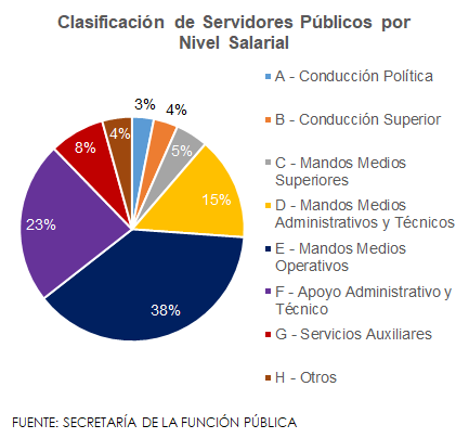 En ese sentido, el nivel E corresponde a mandos medios operativos, concentra en su mayor parte a mujeres, y recibe un salario en el rango de Gs. 4 a Gs.6 millones. Por su parte, la segunda categoría con más sueldos erogados es el nivel F, donde se incluyen las personas que sirven de apoyo administrativo y técnico en las entidades, y ganan un salario de Gs. 2,5 hasta Gs. 4 millones. En Paraguay, la mayor parte de los funcionarios públicos está en la parte administrativa del Poder Ejecutivo, incluyendo ministerios y secretarías.