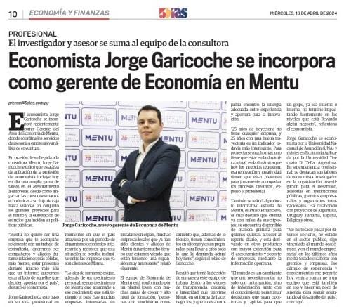 En ocasión de su llegada a la consultora Mentu, Jorge Garicoche explicó que esta área de aplicación de la profesión de economista incluye hoy en día una amplia gama de tareas en el asesoramiento a empresas, desde cómo impactan las cuestiones macroeconómicas a su flujo de caja hasta visionar en conjunto los grandes proyectos para el futuro y la elaboración de estudios que inciden en políticas públicas.