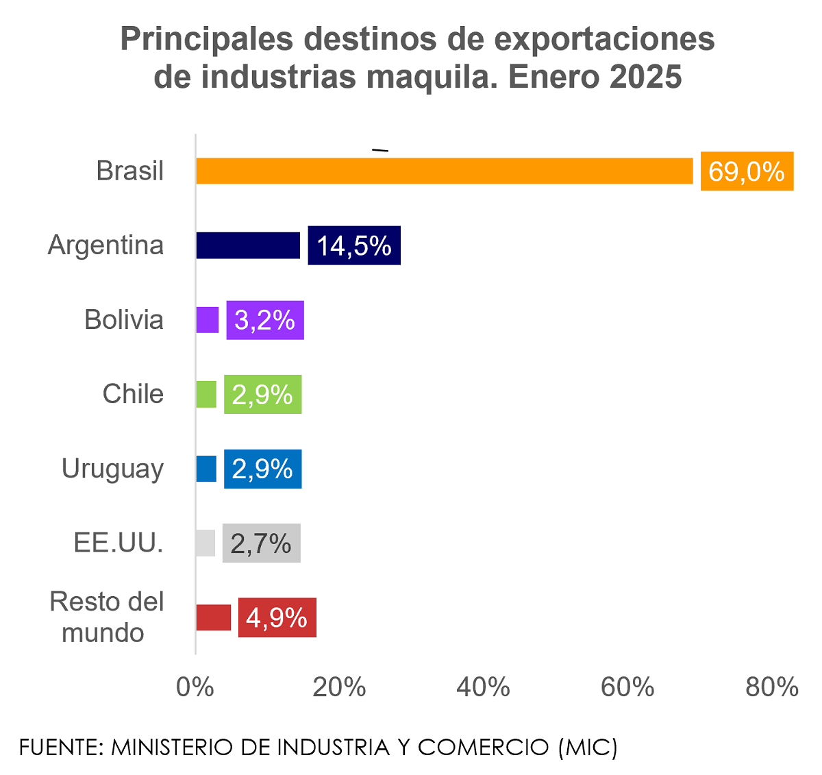 En el primer mes del año 2025, las exportaciones de industrias maquiladoras se incrementaron 34% de manera interanual, totalizaron USD 100 millones. El 86% de estas exportaciones tuvo como destino a países integrantes del Mercosur, 3,2% a Bolivia, 2,9% a Chile y 2,7% a Estados Unidos (EE.UU.).