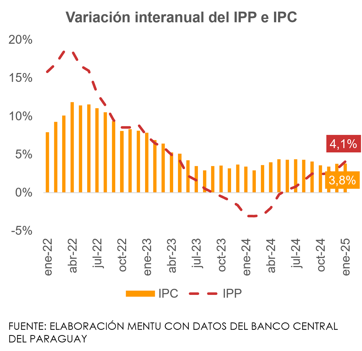 A inicios del 2025, el Índice de Precios del Productor (IPP) alcanzó los 164,4 puntos, reflejando un incremento interanual de 4,1%. Este crecimiento superó en 1 punto porcentual (p.p.) el aumento registrado en enero de 2024, lo que evidencia una mayor dinámica de los precios que enfrentan los productores.