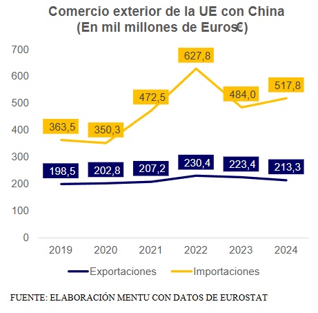 En 2024, la Unión Europea exportó bienes a China por un valor de € 213.300 millones e importó por € 517.800 millones, lo que resultó en un déficit comercial de € 304.500 millones.