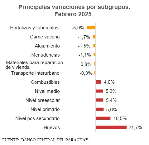 Los precios de los bienes alimenticios presentaron variaciones mensuales mixtas: se incrementaron los de lácteos, bebidas no alcohólicas, aceites, azúcar y huevos, estos últimos impactados por la baja de la producción debida a las altas temperaturas, mientras que los de las hortalizas y de la carne vacuna y sus sustitutos cayeron. Así también aumentaron los precios de servicios relacionados con la salud y los de los combustibles, producto clave para el transporte de cargas y el traslado de las personas.