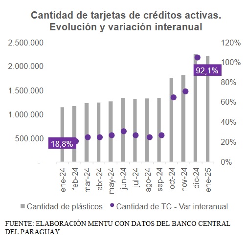 Al cierre del primer mes del 2025, el saldo contable de las tarjetas de crédito emitidas por bancos y financieras alcanzó un nivel histórico de Gs. 4,8 billones (USD 602 millones), marcando el valor más alto registrado hasta la fecha. Este monto representa un aumento del 21% en comparación con enero de 2024.