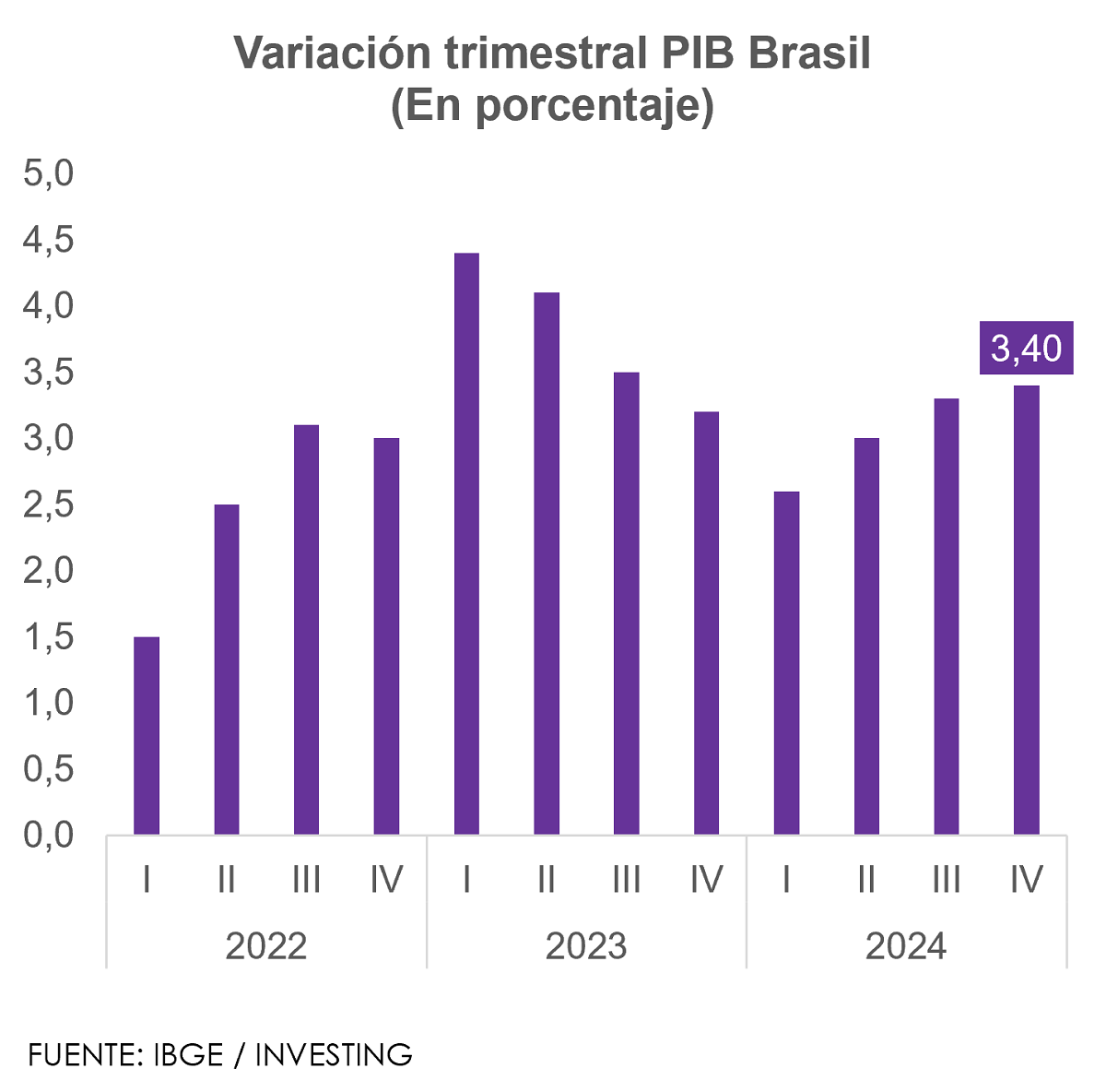 La economía de Brasil creció 3,4% interanualmente en el útimo trimestre del 2024. Este resultado marca el cuarto trimestre consecutivo de crecimiento, con un PIB de 3,1 billones de reales, con los que se acumuló un PIB anual de 11,7 billones de reales.