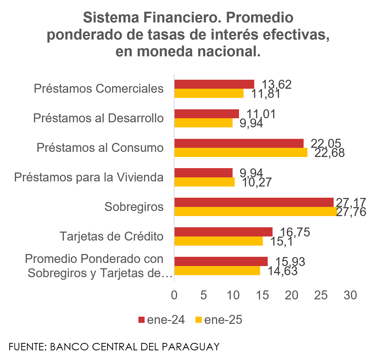 En el mes de inicio del 2025, el promedio ponderado de las tasas de interés activas del sistema financiero (bancos y financieras), para operaciones en moneda nacional, incluyendo sobregiros y tarjetas de crédito, se ubicó en 14,63%, disminuyendo 1,30 puntos porcentuales (p.p.) en forma interanual.
