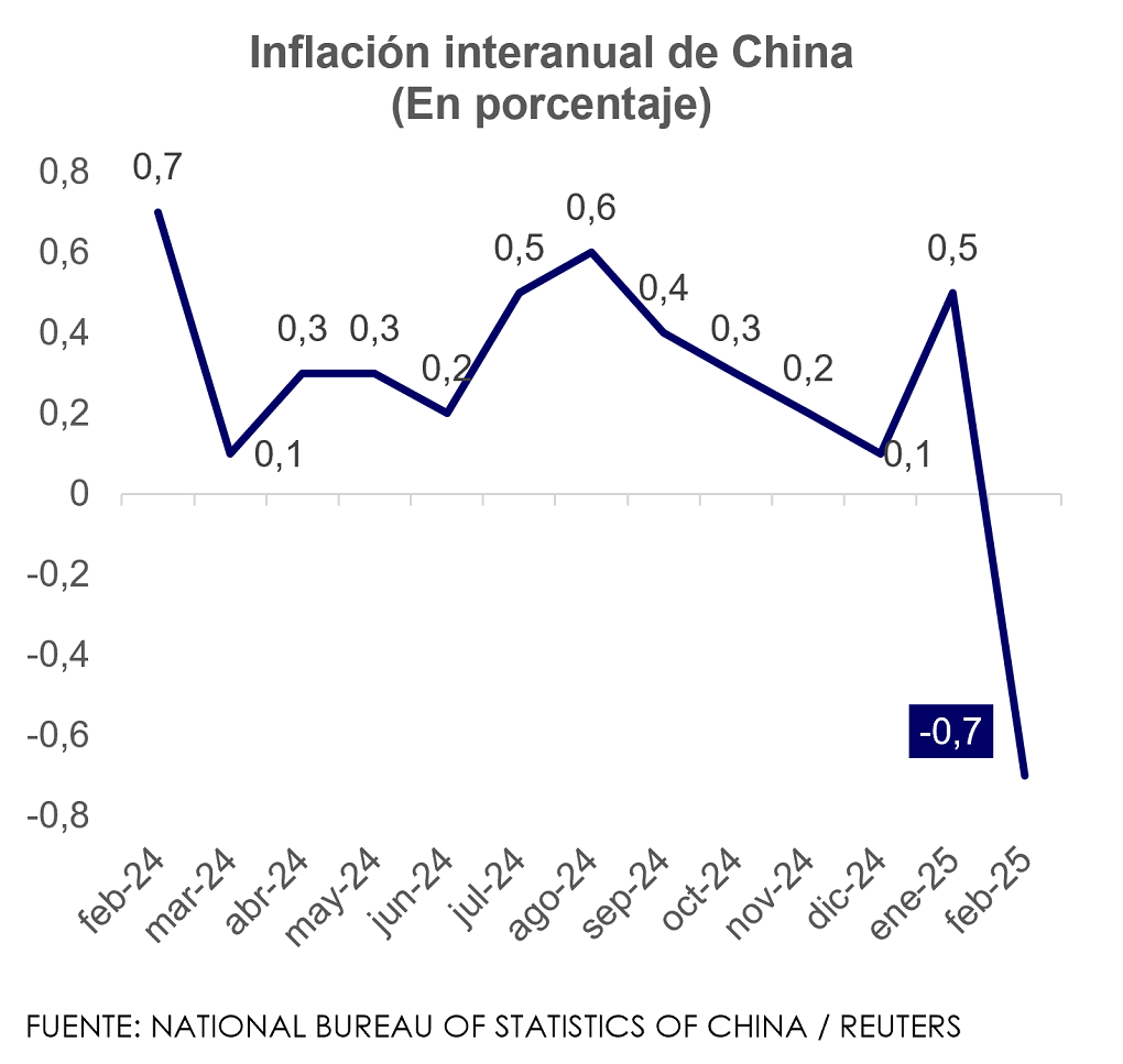 En febrero de 2025, el IPC de China cayó 0,2% mensual, explicado por la reducción de 0,5% de los precios de los alimentos y de 0,1% de los precios de productos no alimentarios.