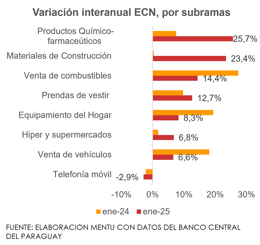 Cuatro de las subramas comerciales consideradas tuvieron dinámicas mayores a los dos dígitos. Las ventas de productos químico-farmacéuticos tuvieron la mayor variación interanual con 25,7%, seguidas por las ventas de combustibles, prendas de vestir, productos para el hogar y alimentos. En cambio, las ventas al por mayor de fertilizantes y agroquímicos cayeron