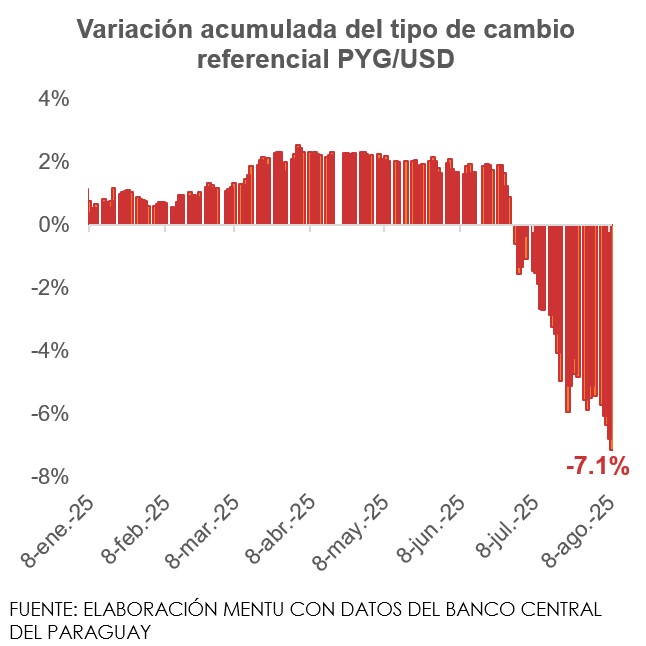 El tipo de cambio referencial cerró la semana pasada en PYG 7.272/USD, siendo el valor más bajo registrado en lo que va del año, y acumulando una reducción de 7,1%. Desde el inicio de la caída, el 25 de junio, el tipo de cambio registró una disminución acumulada del 8,9%, reflejando un marcado fortalecimiento del guaraní frente al dólar en las últimas semanas.