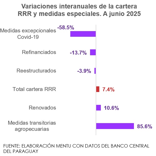 Esto se explica principalmente por el comportamiento de los créditos renovados, que aumentaron 10,6% respecto a junio de 2024, alcanzando PYG 19,5 billones (USD 2,5 mil millones). Sin embargo, los créditos refinanciados y reestructurados limitaron el crecimiento de la cartera RRR al registrar caídas interanuales de 13,7% y 3,9%, respectivamente.