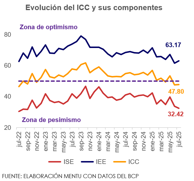 Esta caída se explica principalmente por la percepción a la baja que tienen los consumidores sobre la situación actual, considerando que el Índice de Situación Económica (ISE) se situó en 32,42 puntos, siendo 1,38 puntos menor frente a junio y 8,62 puntos inferior en términos interanuales. Por otra parte, el Índice de Expectativas Económicas (IEE) alcanzó 63,17 puntos, con una variación mensual positiva de 1,63 puntos, aunque se contrajo 5,41 puntos en forma interanual.